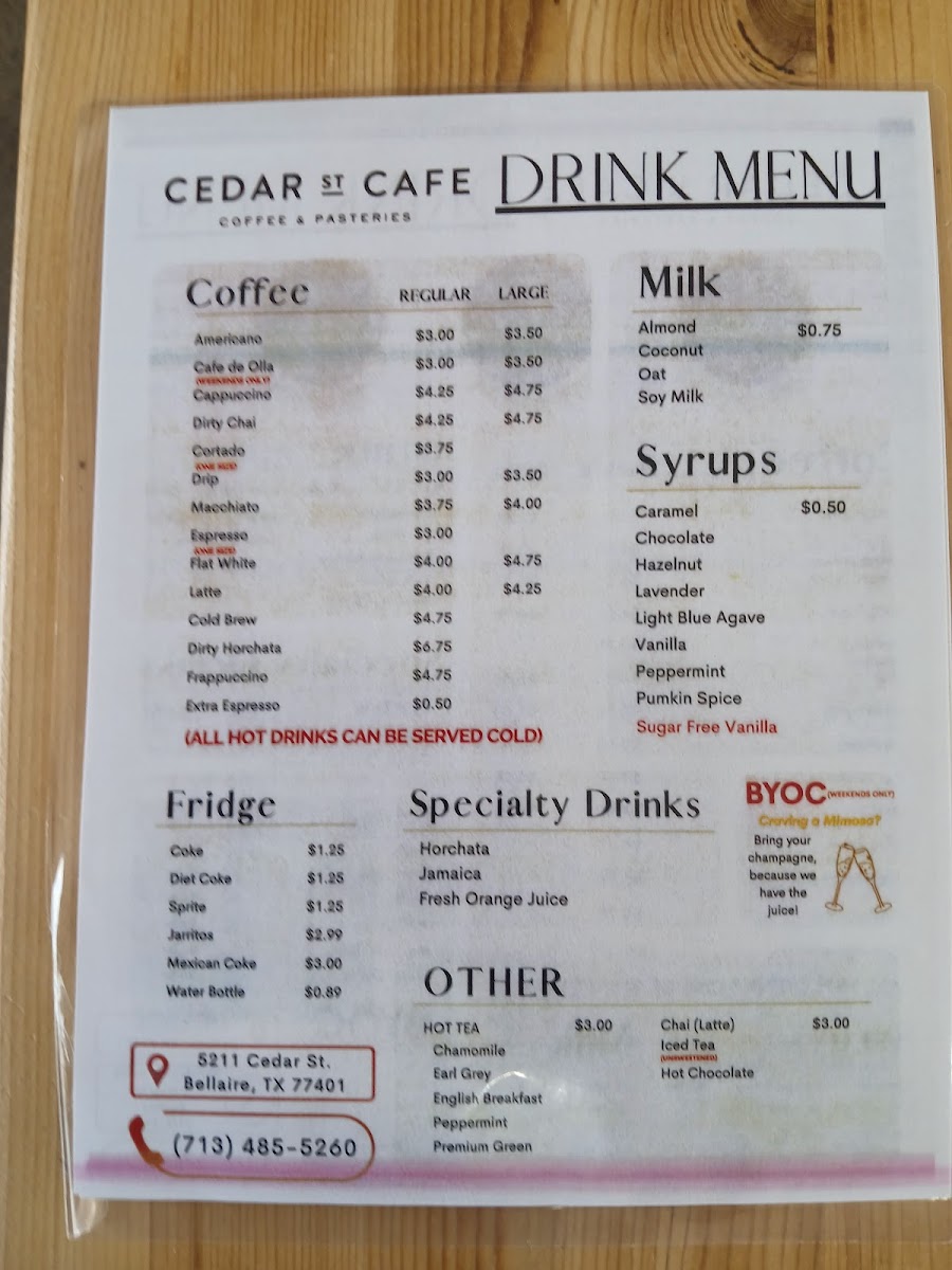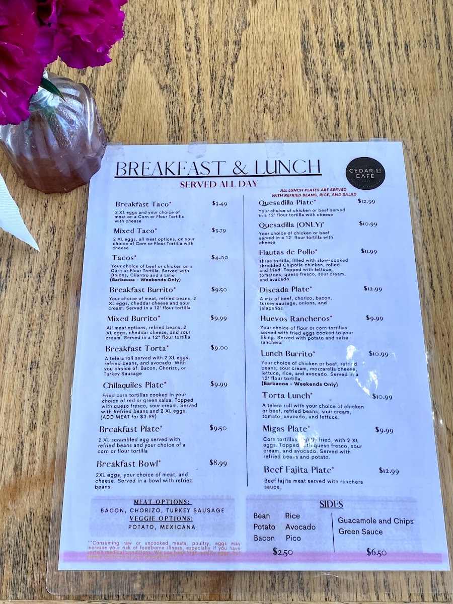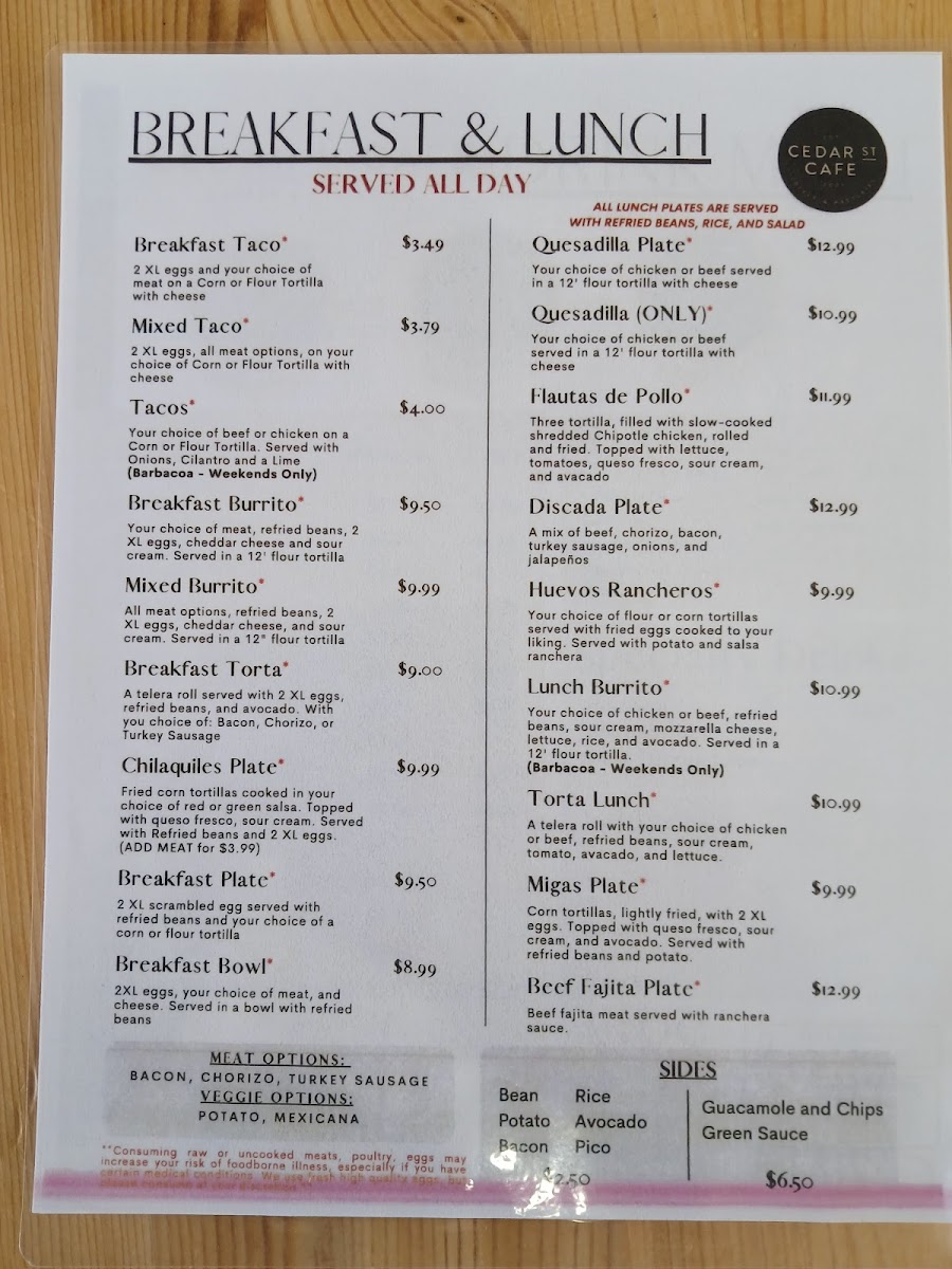 Cedar St. Cafe offers a straightforward and comforting menu, perfect for those seeking casual bites and thoughtfully prepared drinks throughout the day. The menu features a mix of hearty breakfast options and carefully crafted coffee selections that invite guests to settle in for a relaxed morning or a quiet afternoon pause.