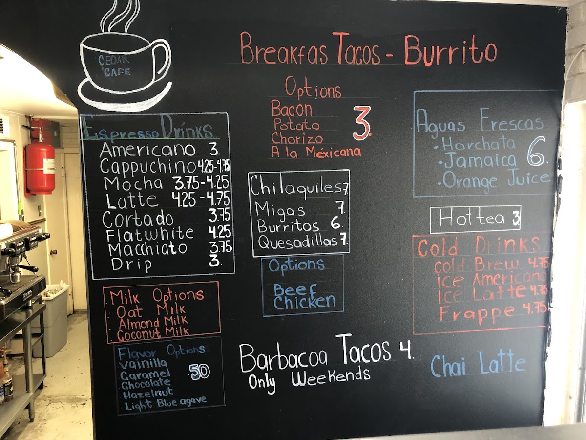 Breakfast items like the Breakfast Burrito, homemade flour tortilla tacos, and the Migas Platter provide familiar, satisfying flavors ideal for starting the day. These dishes pair naturally with the cafe’s coffee offerings, including espresso drinks such as the Cortado and refreshing choices like the Iced Latte, crafted to complement the easygoing, welcoming atmosphere.
